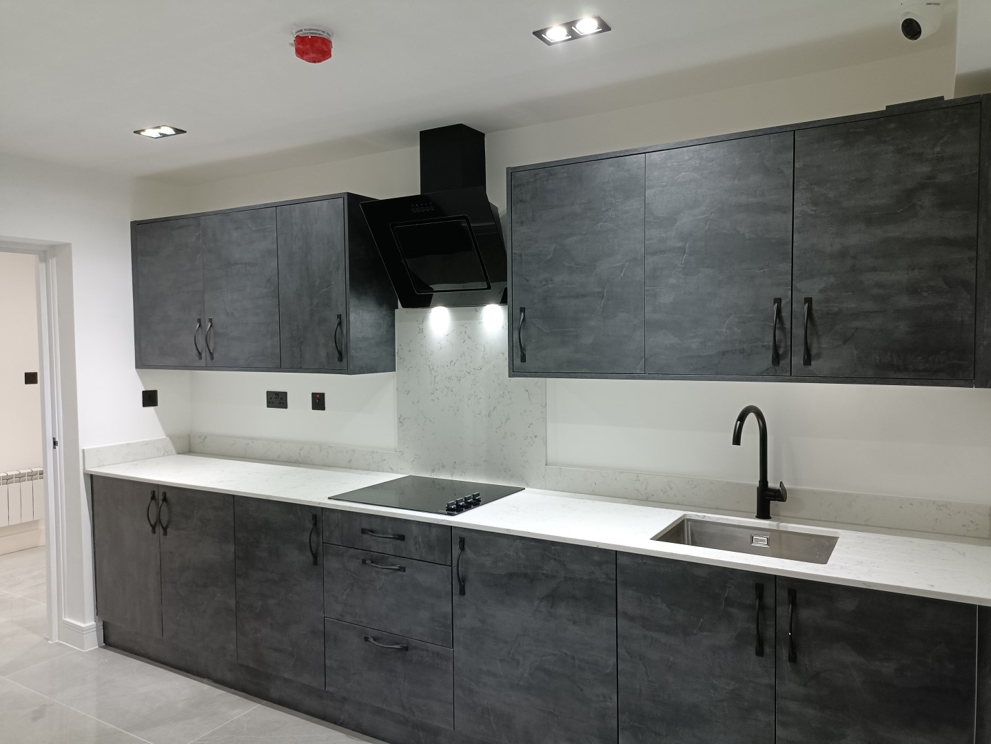 Up on the first floor, the ceiling was again lowered with 6x2 timber, with plasterboards installed and then skimmed. The floor was tiled and new doors were fitted throughout. Radiators were installed every three meters, and a new washroom was added. This floor also saw the construction of a new kitchen, a practical and welcome addition.